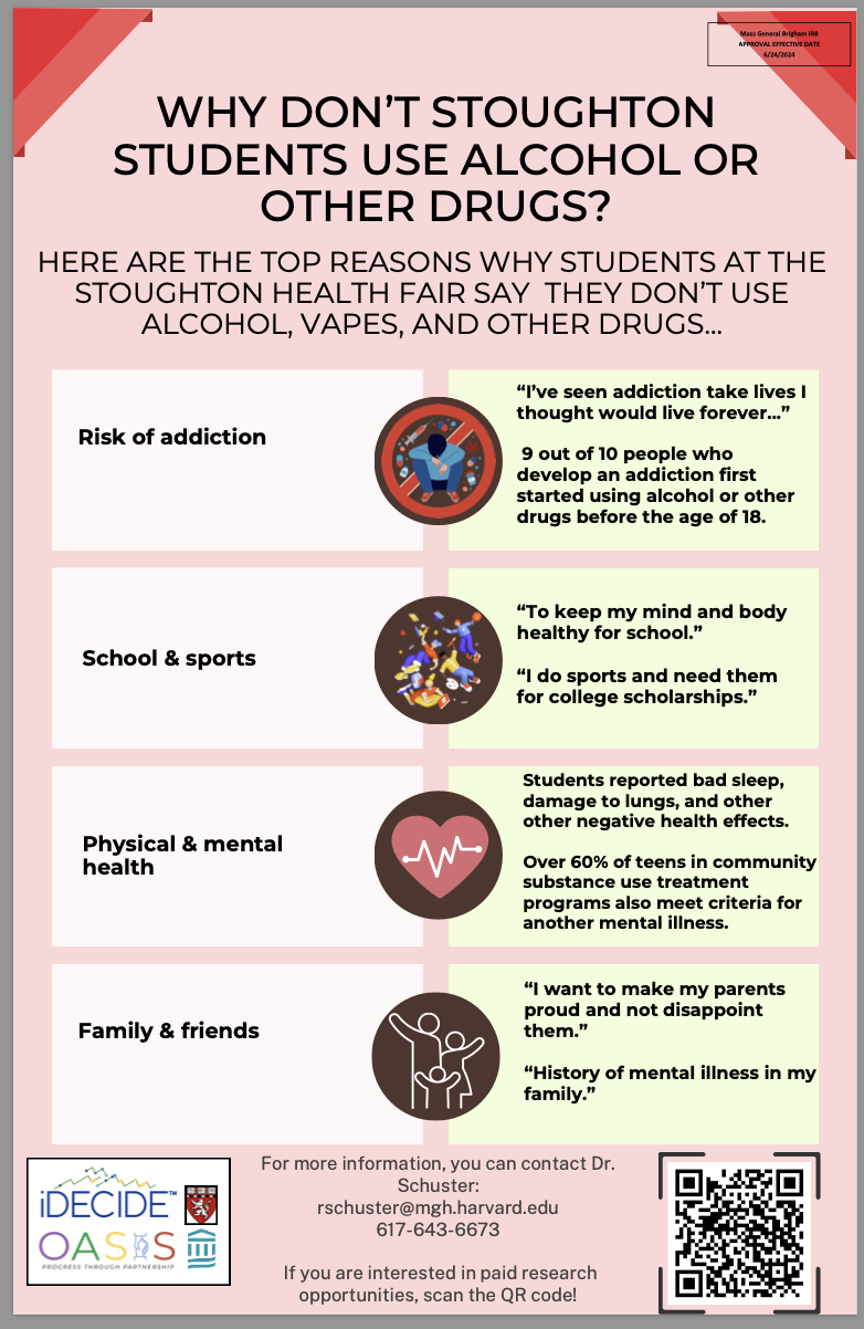 Risk and protective factors are things that may be present or absent in a young person’s life that increase or decrease their likelihood to use alcohol and other drugs. Using youth data and information collected through focus groups and interviews, OASIS has identified risk and protective factors that are more common among Stoughton youth. Here are some few of the risk and protective factors that OASIS addresses through our prevention strategies.